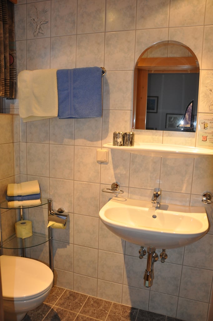 One bathroom comes with a shower cabinet, a bath, a washbasin and a toilet. The other has a shower cabinet, a washbasin and a toilet. There are two cribs available for children up to two years old free of charge. Upon request you can get fresh baked goods delivered daily (for a fee).